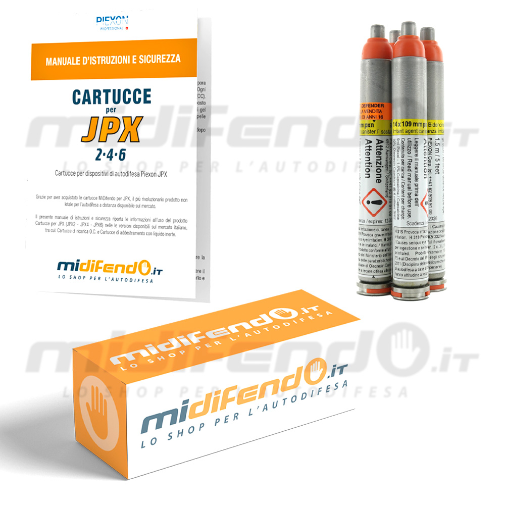 Le Cartucce Piexon consentono di ricaricare la tua JPX4 e contengono un principio di peperoncino (OC) attivo e irritante. La sua soluzione di efficienza debilitante, estrema, è riconosciuta e utilizzata da molti servizi di polizia di stato e vi darà l'opportunità di raggiungere il vostro aggressore fino a 3 metri di distanza (distanza massima consentita dalle leggi e regolamenti Italiani).