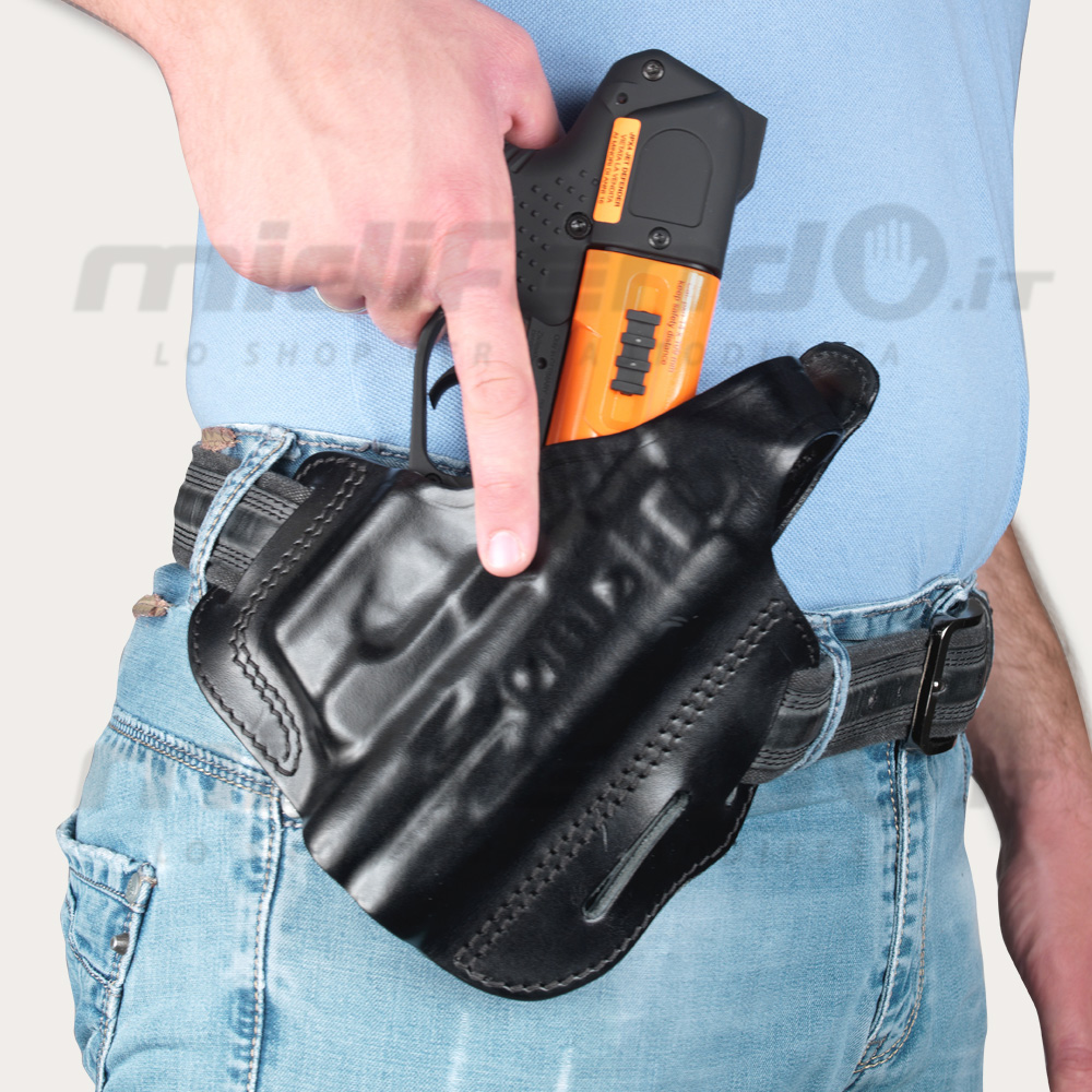 Fondina da portare esternamente agganciata in cintura e realizzata in cuoio di prima scelta lavorato a mano. Grazie a tre asole laterali puoi inserire la cintura in più posizioni diverse. Un laccio di sicurezza resistente all'usura con leva di sgancio irrigidita consente di estrarre la fondina in modo facile, veloce e sicuro.